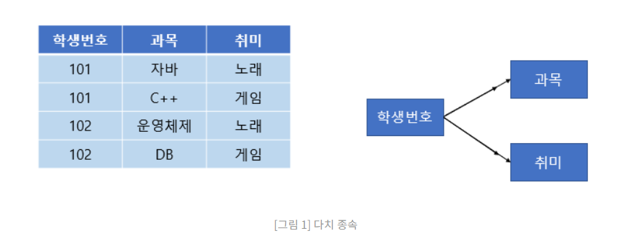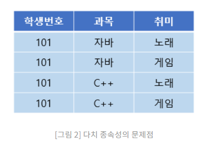 - 릴레이션 간의 잘못된 종속 관계로 인해 데이터베이스 이상 현상 발생 가능