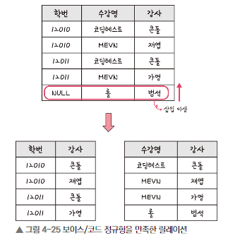 - 강사 속성은 결정자지만, 후보키가 아님 -> 강사 속성 분리해야 함