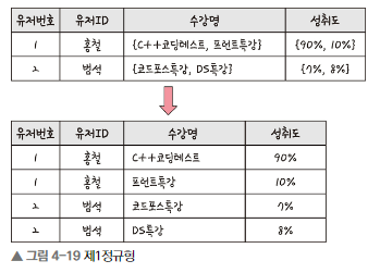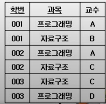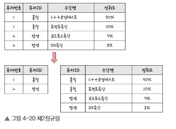 - 삭제 이상: 유저번호가 1인 유저가 "C++코딩테스트" 수강을 취소하면, 해당 과목에 대한 정보가 모두 사라짐(ex 성취도)