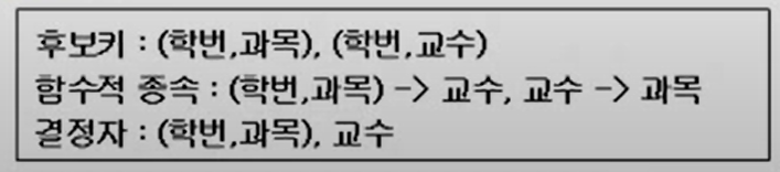 - 결정자가 후보키가 아닌 함수 종속 제거, 모든 결정자가 후보키이어야 함