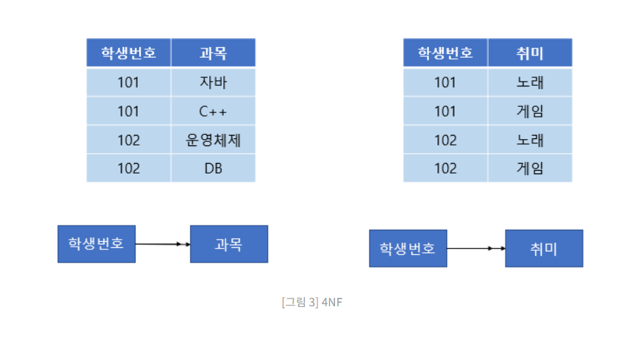 - 2개 이상의 컬럼이 하나의 컬럼에 다치 종속되지 않기 때문에 제4정규화 만족