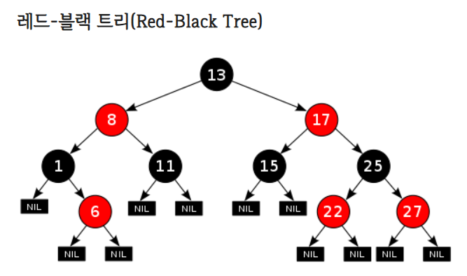 - 레드블랙 트리로 이진탐색 트리의 문제점 보완 -> 부모 노드보다 작은 값 노드는 왼쪽, 반대는 오른쪽으로 배치하여, 데이터의 추가나 삭제 시 트리가 균형을 유지하도록 함