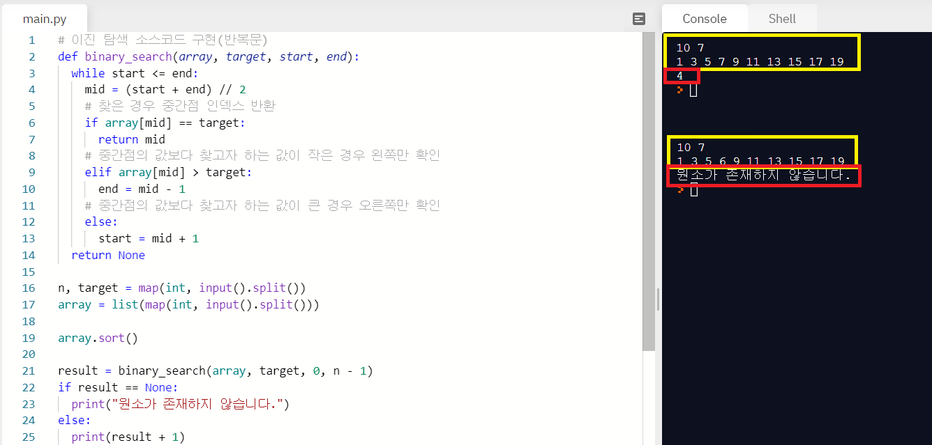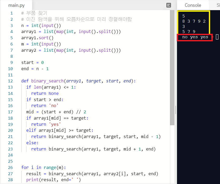 함수에서는 만약 데이터 값을 찾았을 경우 yes를 return하고, 그렇지 않은 경우 target의 값에 따라서 리스트의 mid를 기준으로 왼쪽만 검사할지 , 오른쪽만 검사할지 결정하고 함수에 인자값들을 변경하여 target값을 찾을 때까지 반복한다.