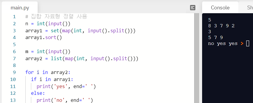 해당 문제는 단순히 특정한 데이터가 한 번이라도 등장했는지의 여부만 검사하면 되기 때문에 집합 자료형을 이용해서도 문제풀이가 가능하다.