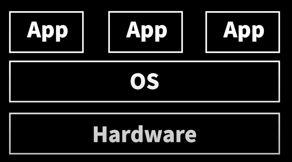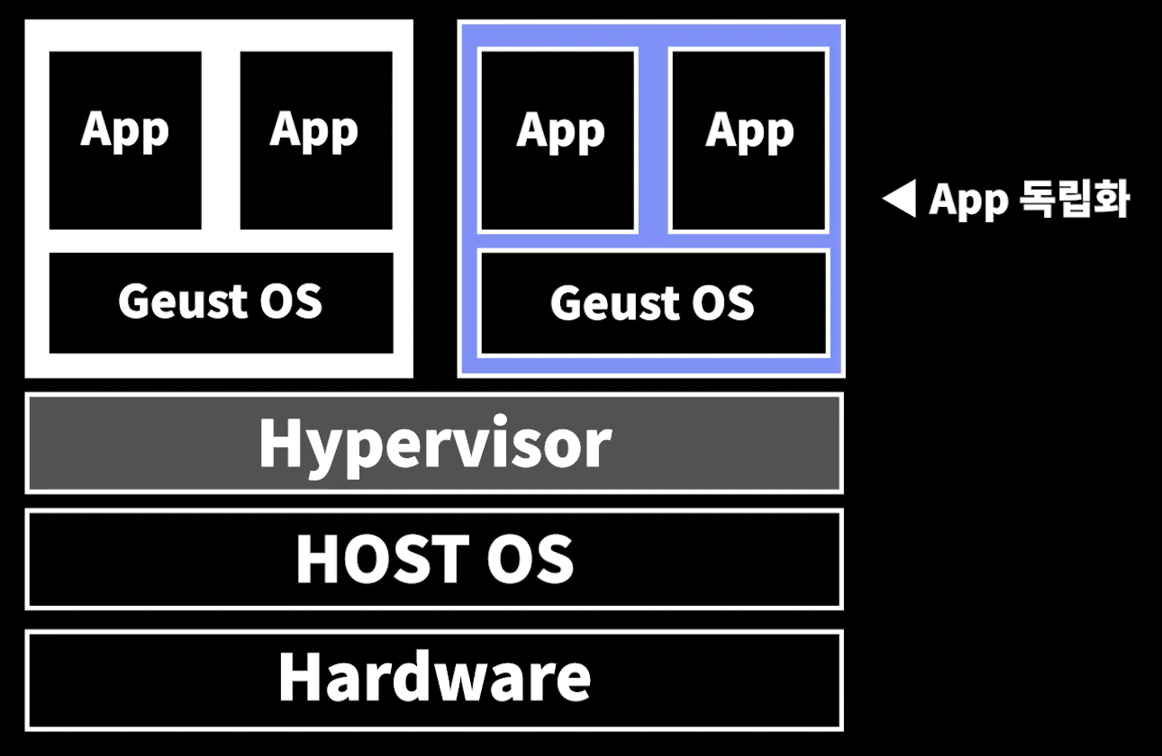 - Hypervisor라는 SW 기술을 가지고 가상화된 컴퓨터 위에 독립적으로 App을 운영