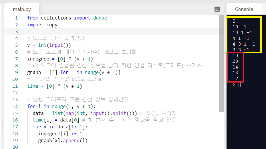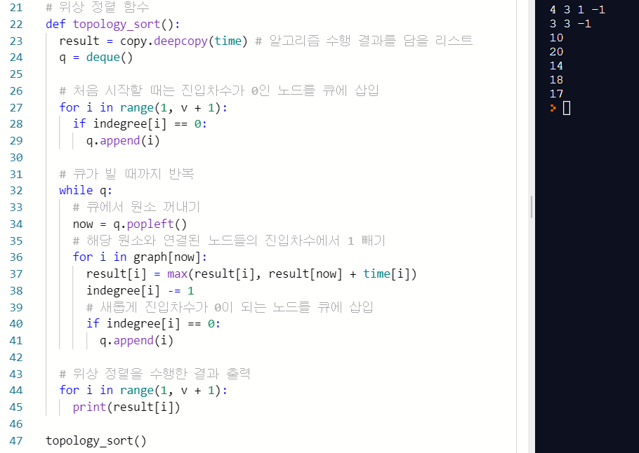 위의 문제는 이전에 순서만 다뤘던 위상 정렬 알고리즘에서 추가적으로 시간값을 더하는 연산이 추가되었고, 입력받은 time값을 저장한 time 리스트와 별개로 최종적으로 각 강의를 수강하기까지의 최소 시간을 저장할 result 리스트를 만드는 과정에서 copy 라이브러리의 deepcopy() 함수를 사용하였다.