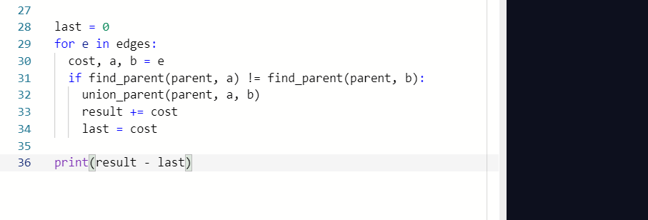 어차피 코드내에서 간선의 비용에 대하여 오름차순으로 정렬하였기 때문에, edges 리스트의 마지막 값을 구하고 그 값을 전체 비용에서 빼주면 간단하게 해결할 수 있는 문제였다. 어려운 문제가 아니었는데,,,,,,
