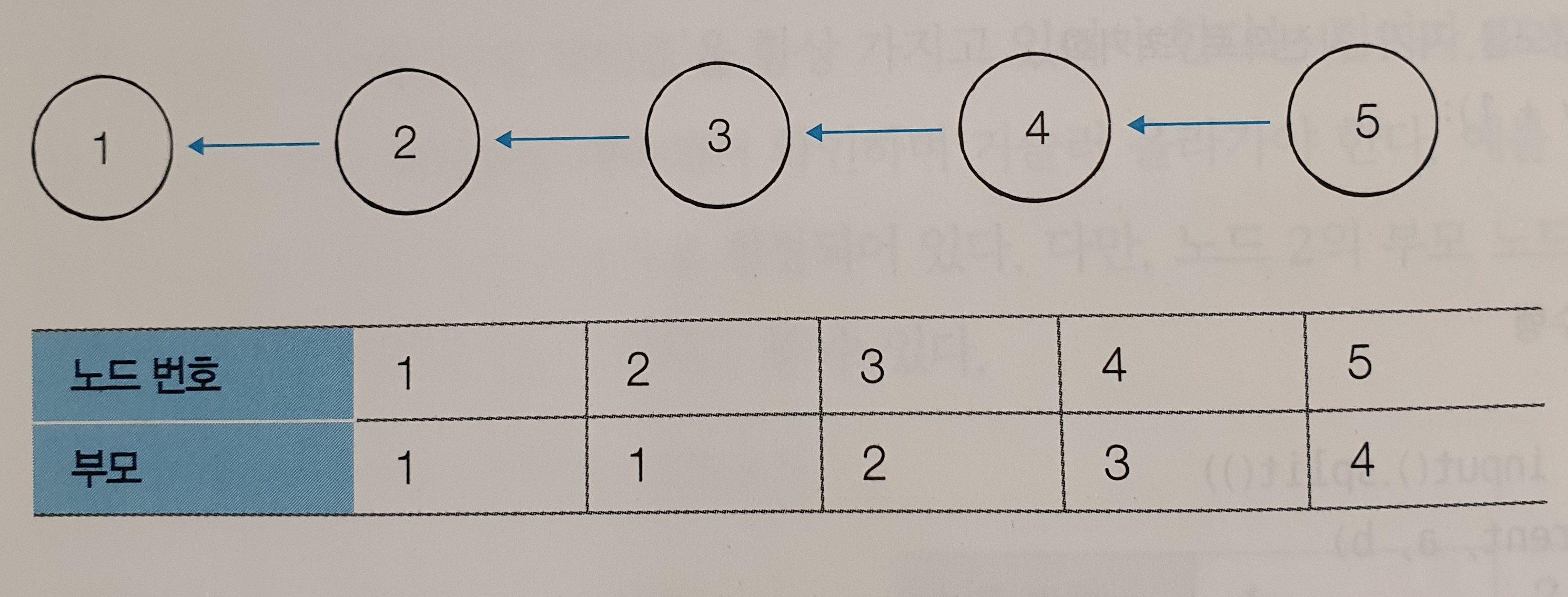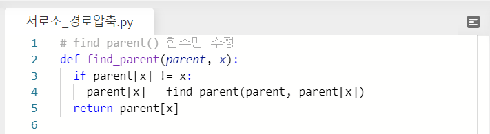다만, 위의 find_parent() 함수는 비효울적이다. 최악의 경우 모든 노드를 다 확인하게 되면 시간 복잡도는 O(V)이다.