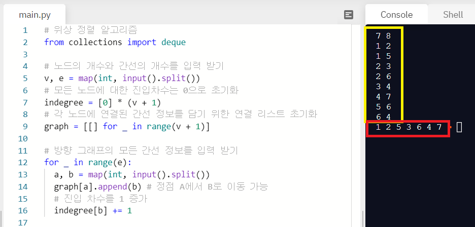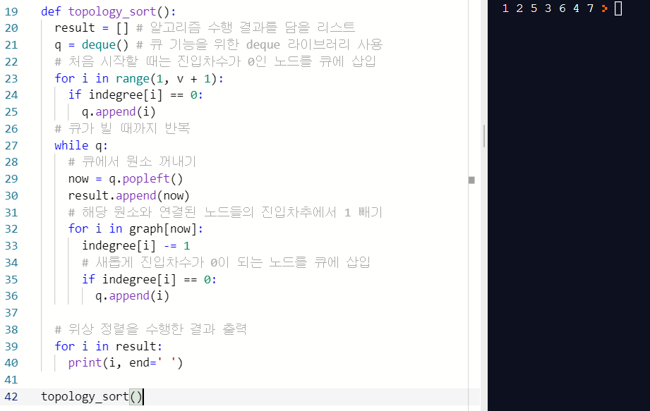 topology_sort() 함수에서 진입차수가 0인 노드를 쿠에 삽입하고 q가 빌 때까지 반복하는데, 매번 q에서 꺼낸 노드를 result라는 list에 삽입하고, 해당 노드와 연결된 노드들의 진입 차수값을 1씩 감소시키고, 진입 차수가 0이된 노드를 q에 삽입한다.