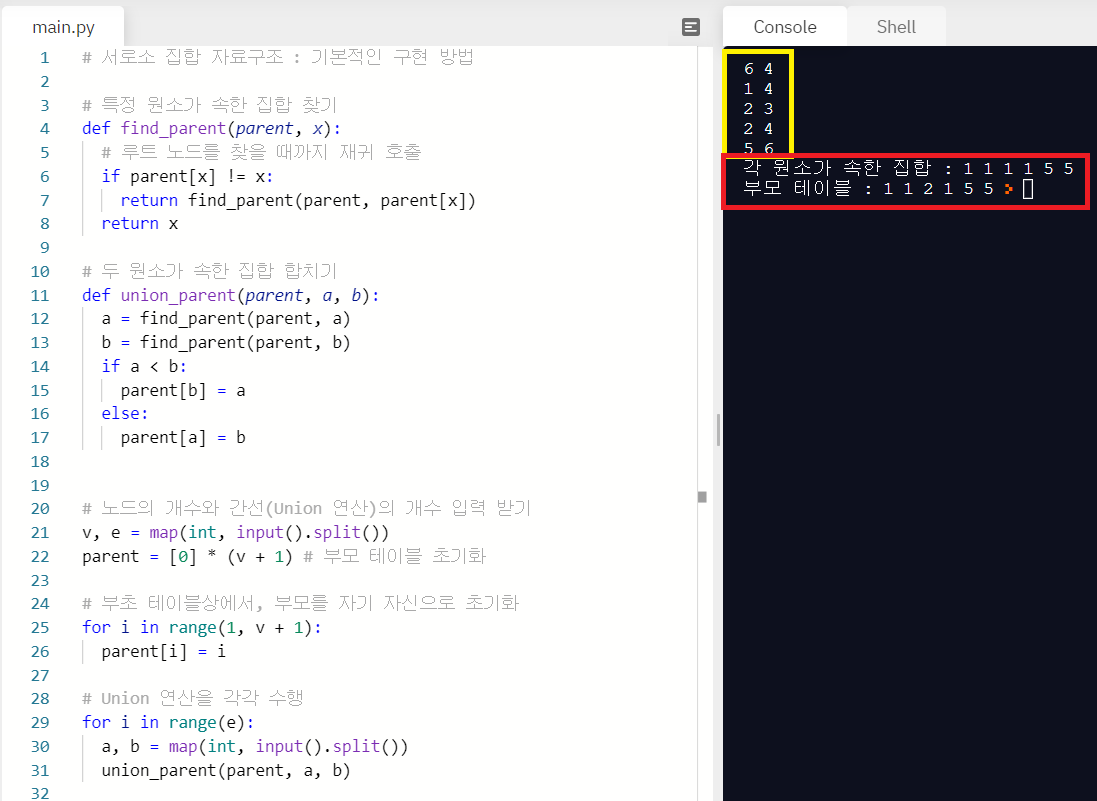 union_parent() 함수에서는 각 노드의 부모값들을 find_parent() 함수에서 리턴받고, 해당 값들 중, 더 작은 값(우선순위가 더 높은 값)을 더 큰값의 루트 노드로 설정한다.