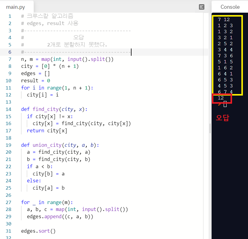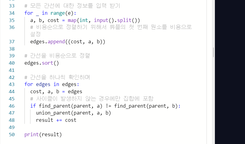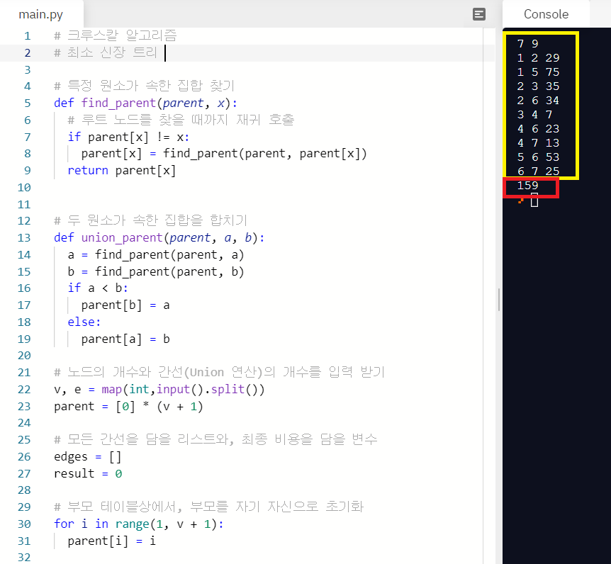 기존의 find함수와 union함수는 동일하고, 입력받은 데이터값들 중에서 노드, 노드, 간선 비용 순으로 입력 받았지만, 간선 데이터를 저장하는 리스트에는 비용을 (비용,노드, 노드)의 튜플 형태로 삽입하였다.