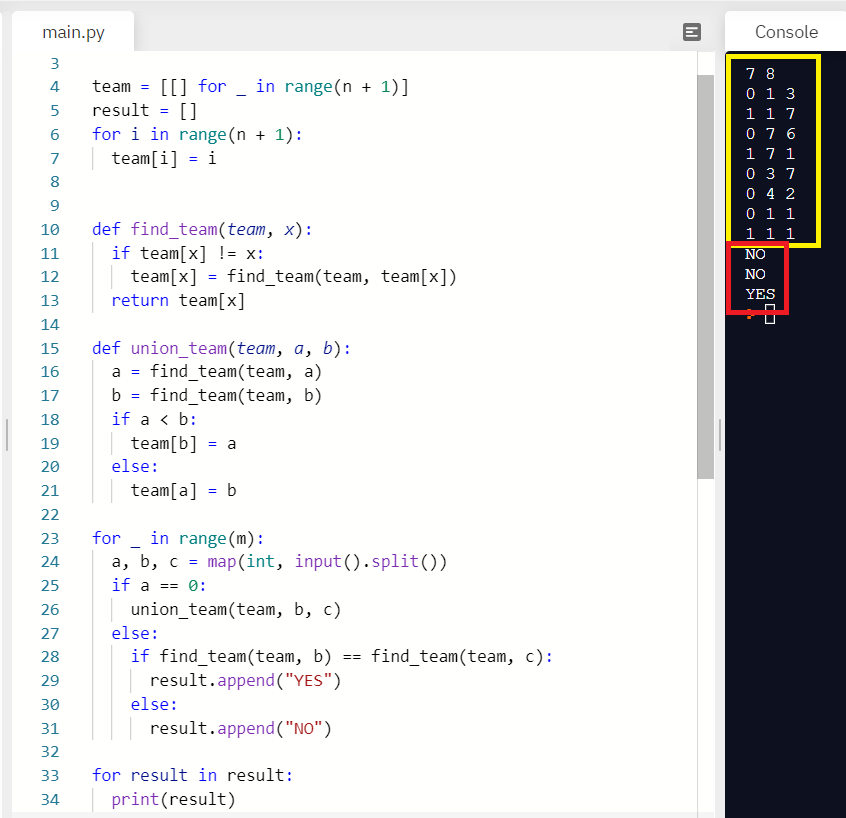 find함수와 union함수도 수정할 필요없이 바로 사용하였고, 단지 각 줄의 첫 번째 입력값에 따라서 다른 역할을 하도록 제어문만 구현하면 쉽게 풀 수 있다.