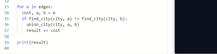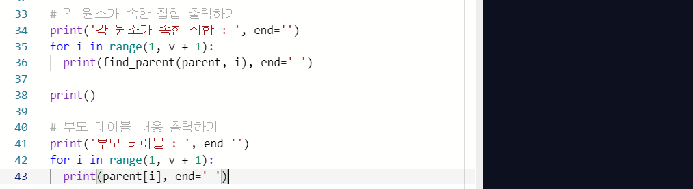 그리고 반복문으로 간선 리스트의 데이터값들을 가져와서 각각의 부모 노드를 비교하여 부모 노드가 서로 같다면, 사이클을 발생시킬 수 있기 때문에 제외하고, 그렇지 않은 경우에만 두 노드를 합치고(union), 두 노드간의 간선 비용을 누적하여, 모든 간선을 확인한 후, 누적된 비용을 출력한다.